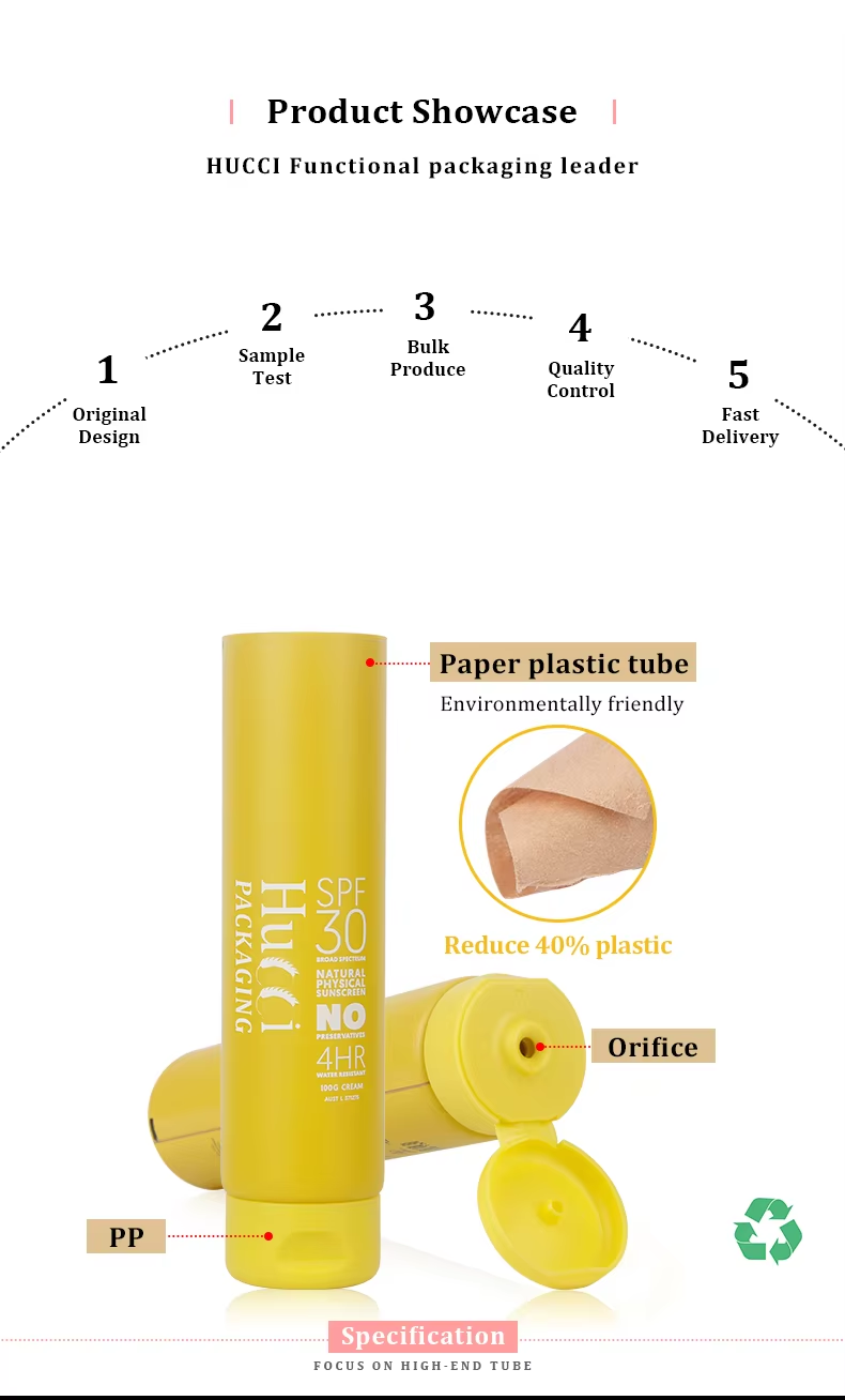 Now eco-friendly packaging tubes are more favourable and welcome by our overseas customers. This kraft paper plastic tube helps reduce 40% plastic usage. Sugarcane green plastic, PLA biodegradable plastic, PCR recycled plastic and Kraft paper plastic tubes are very popular worldwide. HUCCI produce various eco tubes, if you are looking for reliable supplier. Here we are!