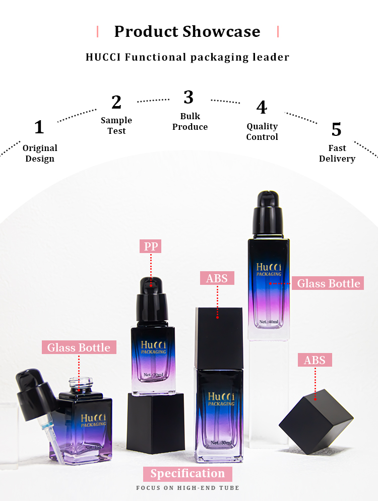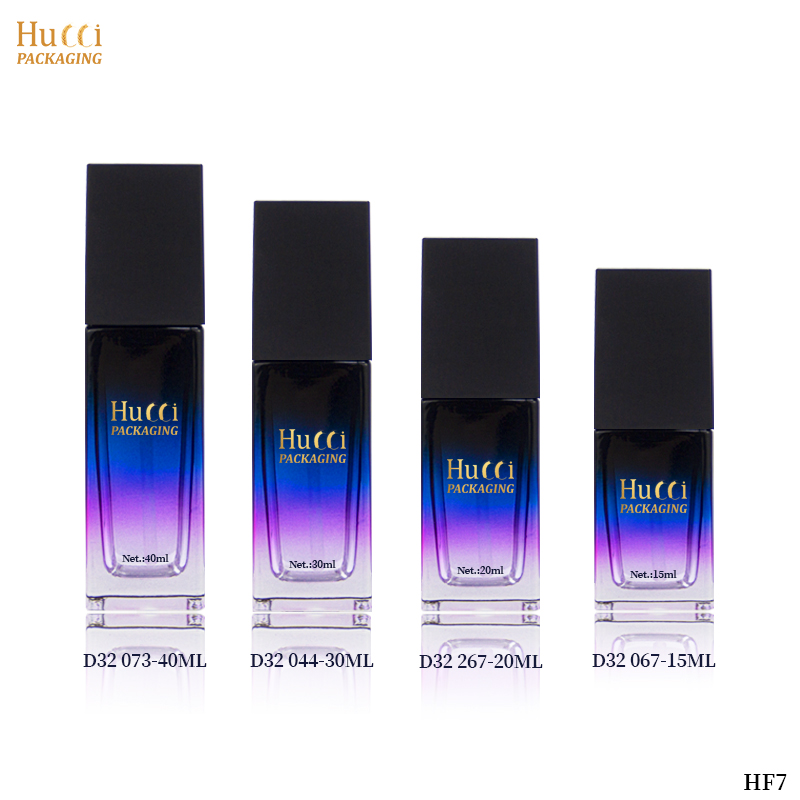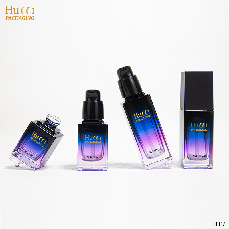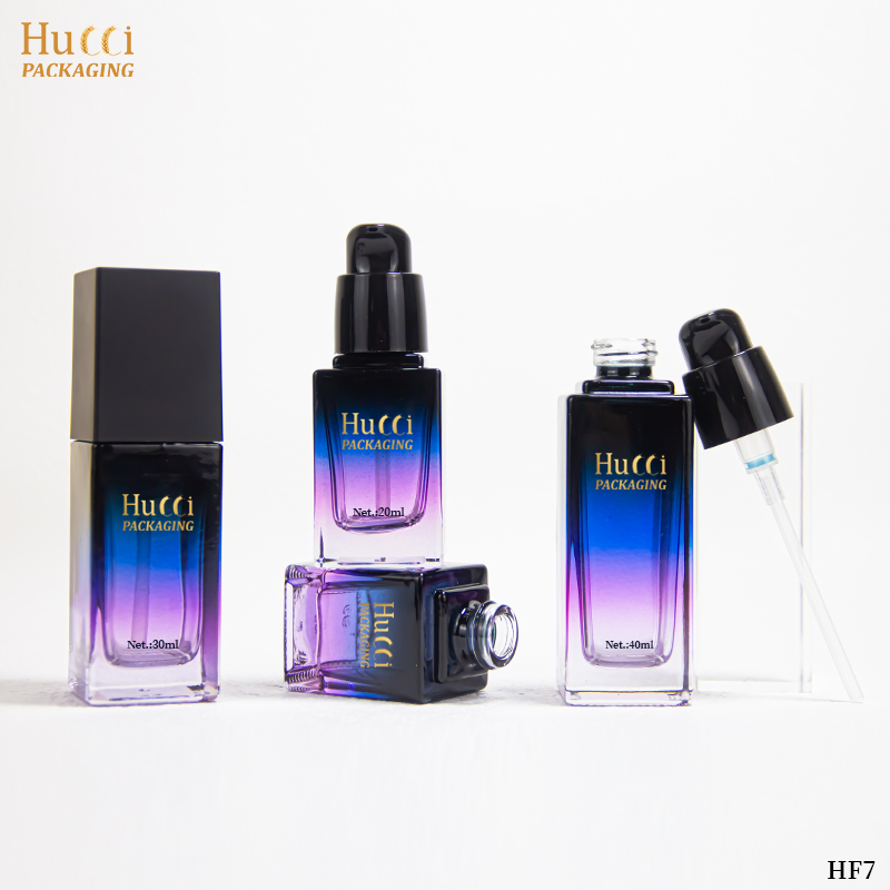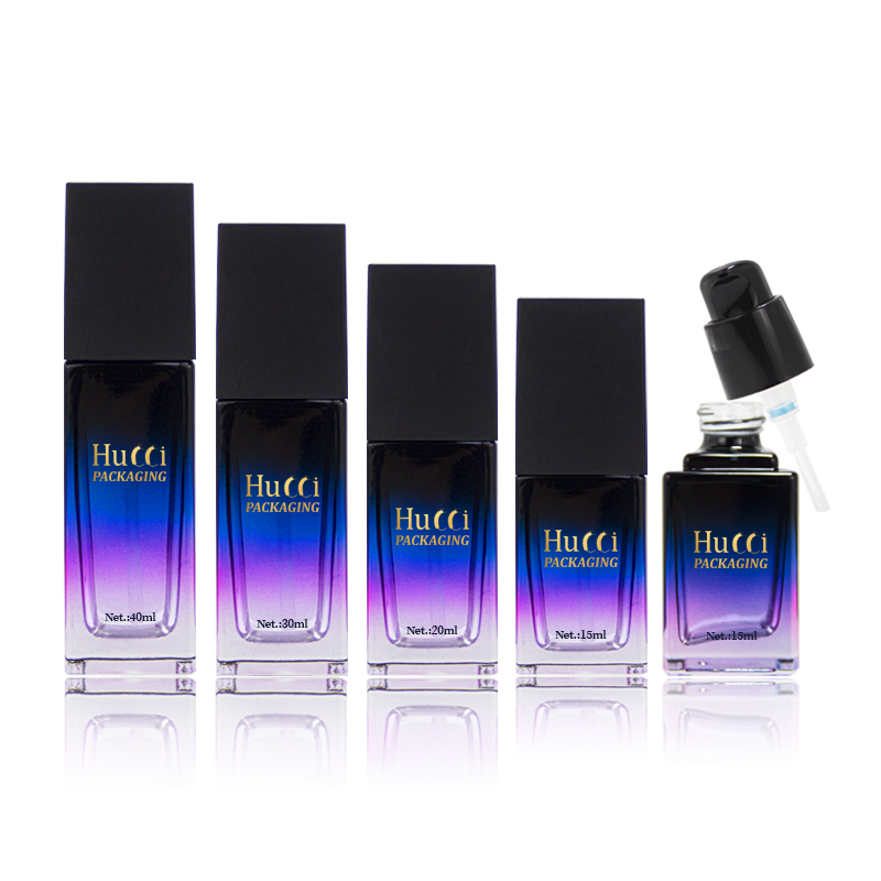 This gradient purple cosmetic glass bottle comes with an ABS outer cap and a PP airless pump dropper.