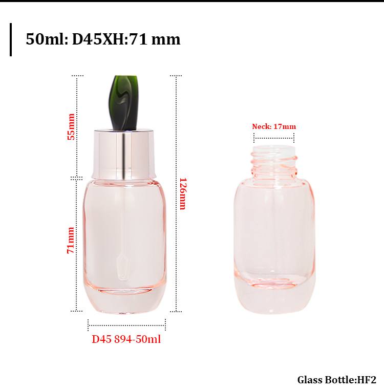 This cosmetic glass bottle is equipped with an ABS outer cap and pp plastic ppplicator and MS green hand shank.